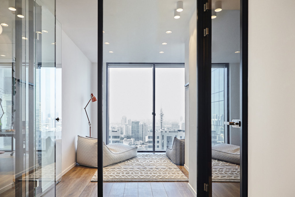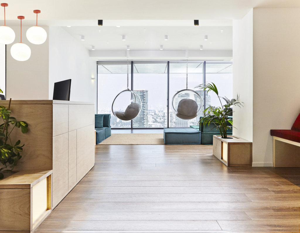 設計理念-專業,干凈,簡單和舒適-靈感來自公司的關鍵屬性。家具、室內裝潢和照明都是定制的,特別強調顏色和材料.在開闊的空間里,白色的墻壁與地板,輕木定制家具,綠色和黃色沙發和紅色的火花,體現照明元素和凳子。