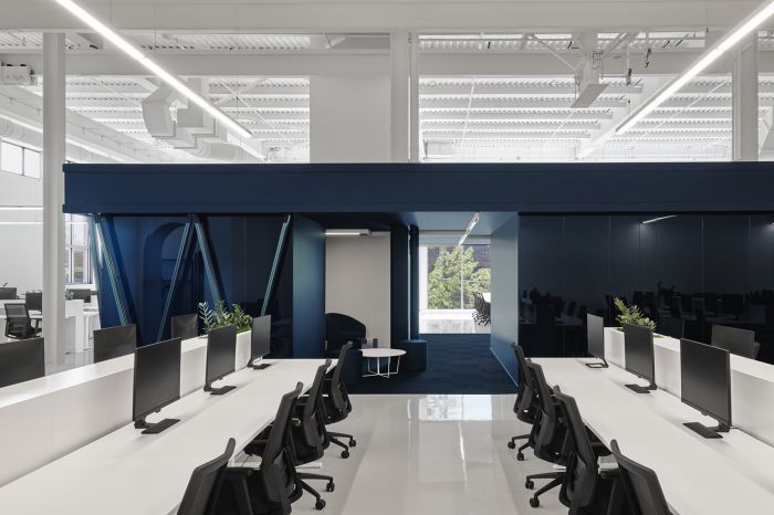 這是一個(gè)舊工廠改造成的辦公室,改造后共有兩層新的辦公空間,擁有1500方的面積設(shè)計(jì)師在空間中建造了一個(gè)體塊用來劃分空間,同時(shí)創(chuàng)造了一個(gè)休閑區(qū)域。