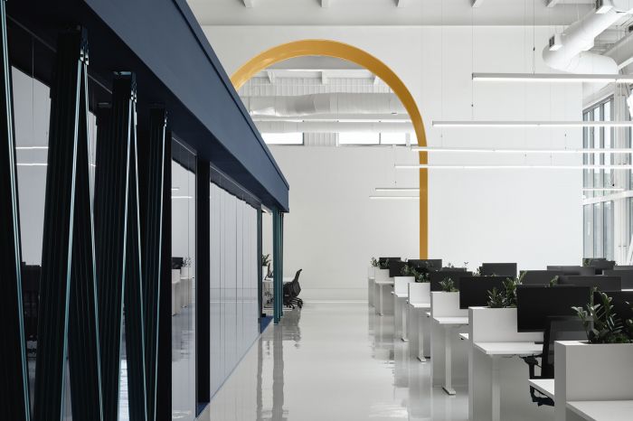 受到都市風(fēng)格的啟發(fā),工作和會議室類似于城市里的公共和娛樂空間。主體塊的一側(cè)設(shè)置了一道紀(jì)念性的拱門,另一側(cè)是一座適應(yīng)性的地臺,可以用作前廳。連接兩層的結(jié)構(gòu)將空間激活成為了一個(gè)間隙場所。