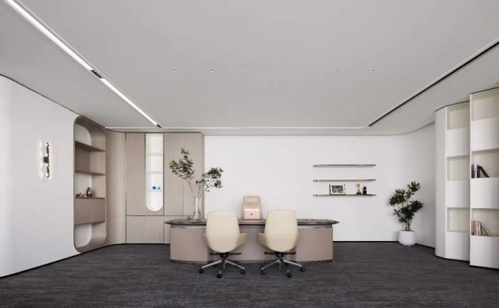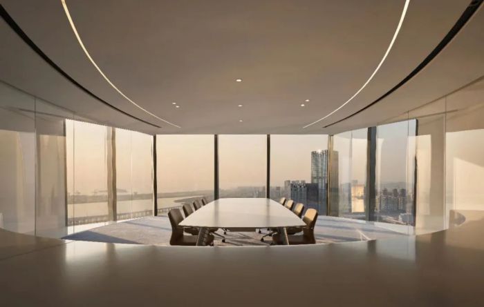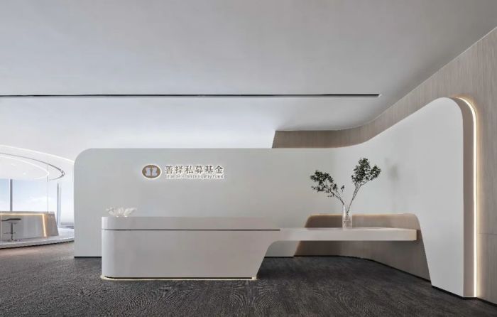 這是一個金融行業公司的辦公室,有1100方的面積。設計目的是營造舒適健康的金融商務空間,并體現一種帶有大地藝術氣質的室內美學。設計風格采用大而平順的弧度和圓潤的造型,注入了柔性力量。