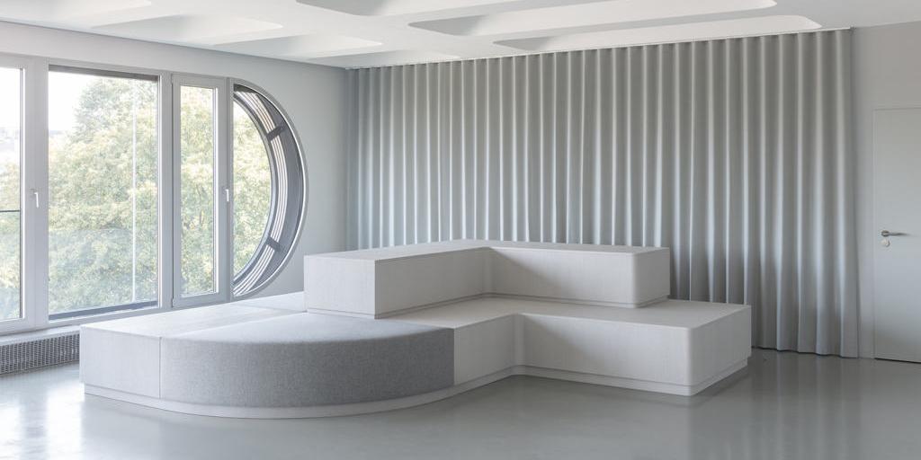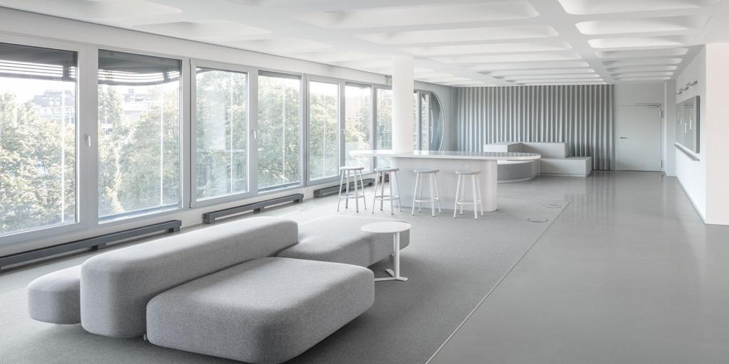 采用整體方法并將其轉化為物理概念,將三樓一個大空地周圍的新空間分為三個部分:一個座位區、一個長吧臺和一個有自己工作墻的舞臺。地毯和窗簾是用來標記之間的過渡地區,同時也改善了聲學。