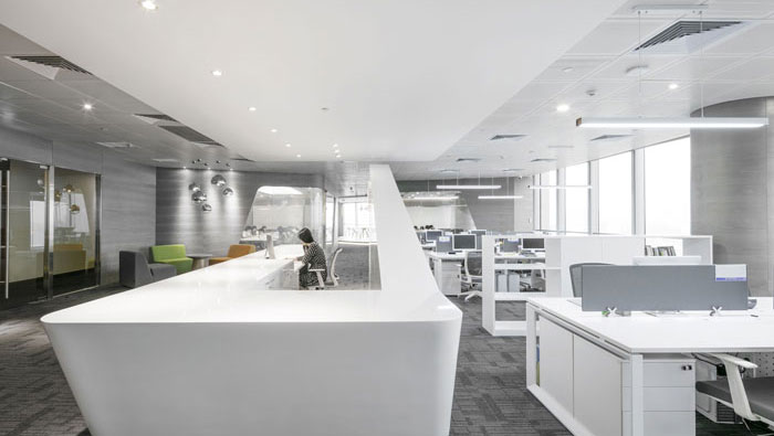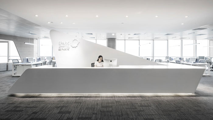 ?  前臺的設計:前臺給人的感覺好像從天而降一般,這也是因為整個空間呈開放式分布,設計師為了避免整個空間一覽無余,故此選用造型新穎、別致的前臺,這樣的前臺除了承擔起接待的任務,同時也要承擔阻隔的作用,在山尖處設計師將logo安置在此處,為企業的發展指明了方向。