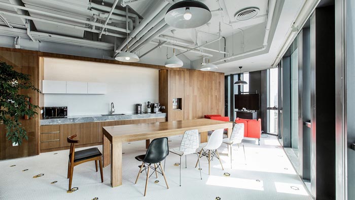茶水間的設計:設計師在設計的時候,將其安置在空間的一個角落區(qū)域,此處呈三角形分布,設計師在設計中將茶水柜安置在空間三角的一條直線上靠墻分布,這樣的好處就是可以為空間留下足夠的使用空間,其中分布有休息桌椅、電視柜、沙發(fā)等,這樣可以讓員工在此地得以放松與歸零。