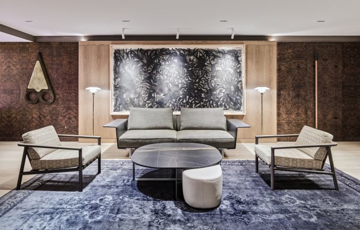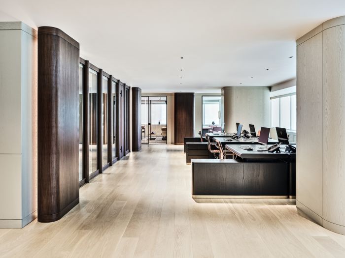所有的辦公室都是開放式設計,透明玻璃門劃分了工作區域。從接待區到工作區,木材材料逐漸使用,所以整個辦公室的調色板以米色和棕色為主。該項目的主要棕色色調以木質元素和 大理石細節為特色。