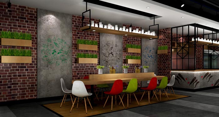 川漁館前臺裝修設計:紅磚為空間帶來了一種記憶色彩,川漁館的理念就是帶來記憶中的味道,在地地道道的川菜館中,嘗到川菜最地道的味道,讓客戶體驗川菜最初的味道。