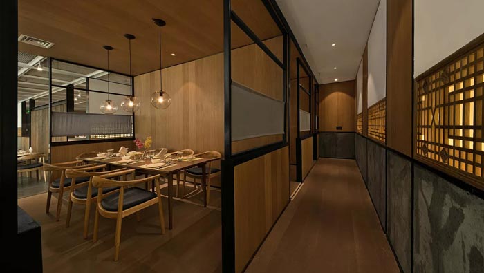 特色川菜館過道設計:設計師在過道設計中,以餐區為設計主線,設計師的目的就是希望兩者之間相處的更加融洽,在設計師看來,設計就是將空間與空間、區域與區域相互融合。