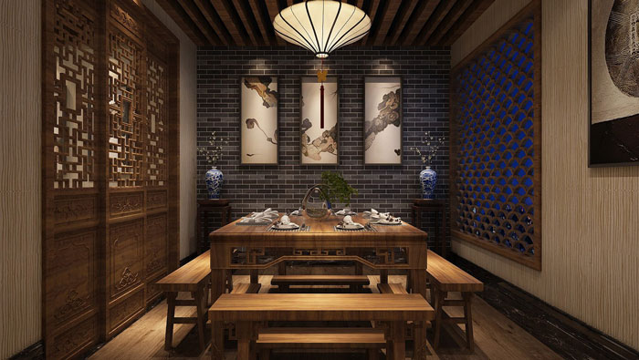 中式川菜館大廳裝修設計:大廳給人的感覺好似回到過去,但是又稍有不同,設計師在中式設計的同時,也加入了很多現代元素,目的就是希望營造一個古代、現代融合的空間。