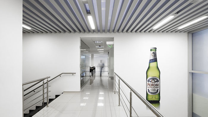工廠廠房辦公區二樓裝修設計:二樓過道好似云梯,潔白的空間給人一種別樣的感覺,讓空間不在單調,大大的啤酒瓶鑲嵌在空間的白墻上,既做為點綴,同時也作為企業的品牌宣傳。