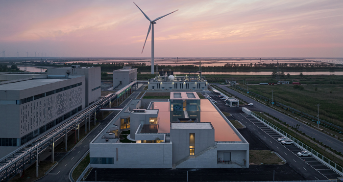 這是一個新能源材料行業(yè)的工業(yè)廠區(qū)的設(shè)計案例。廠區(qū)建筑以水為主題,水上的漣漪仿佛叩響生命與物質(zhì)的存在邊界。生產(chǎn)車間的發(fā)酵恒溫水排走之前,在辦公區(qū)屋頂匯成淺池。