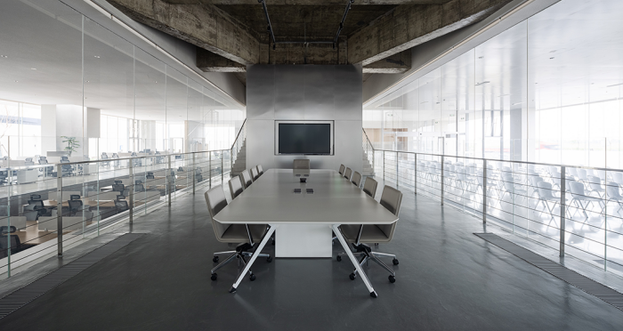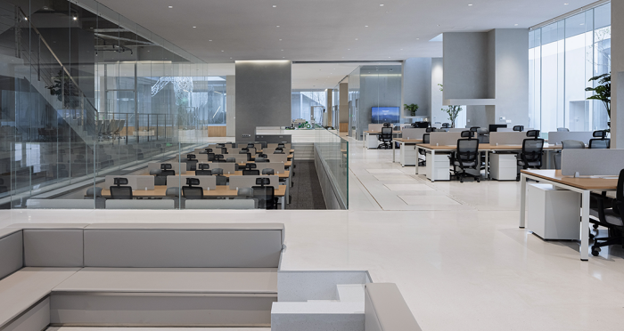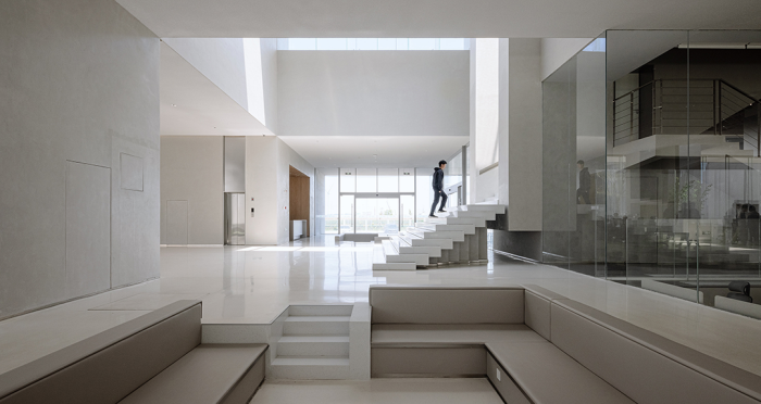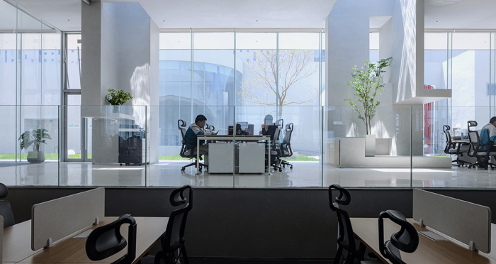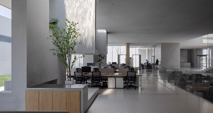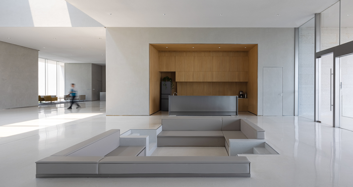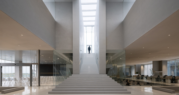 展廳、會客廳和行政會議室凸出水面,辦公區(qū)、會議室、員工食堂、廚房和多功能廳等大部分空間沉在水面以下,墻柱等構(gòu)筑物和房間像細胞器一樣自由分布,具有極好的漫射采光。