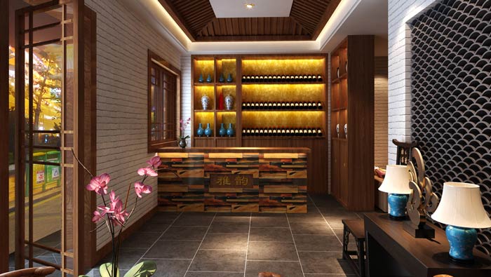 中式茶餐廳引導區設計:此處正對包廂,讓無微不至的服務體現在每一個細節當中,之所以在這里安置吧臺,是避免出現服務死角,設計師希望讓客戶體會到無微不至的服務。