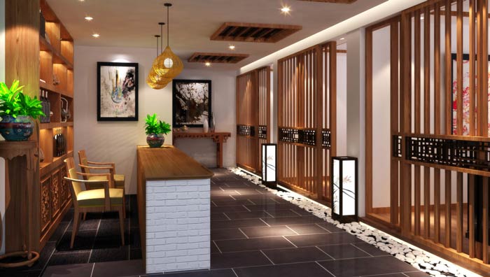 中式茶餐廳進門區設計:現在讓人聊天的場所已經越來越少了,茶餐廳就是其中之一,中式元素為空間營造了難得的清靜,讓客戶進入空間后,感受到這難得的清靜時光。