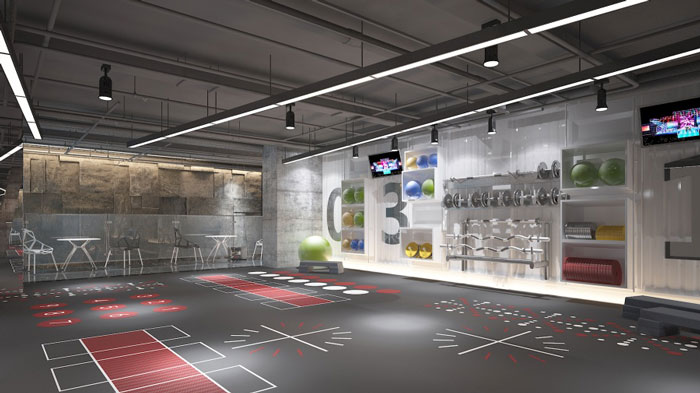 設計理念:根據甲方對此健身房的功能需求,將其分為動感操房、多功能地膠區、瑜伽房、衛浴區和儲物更衣室五個區域。