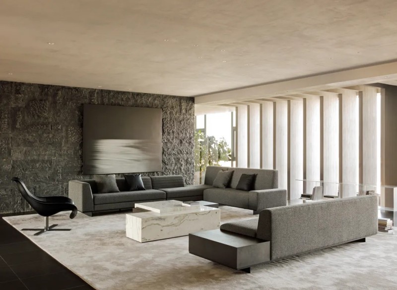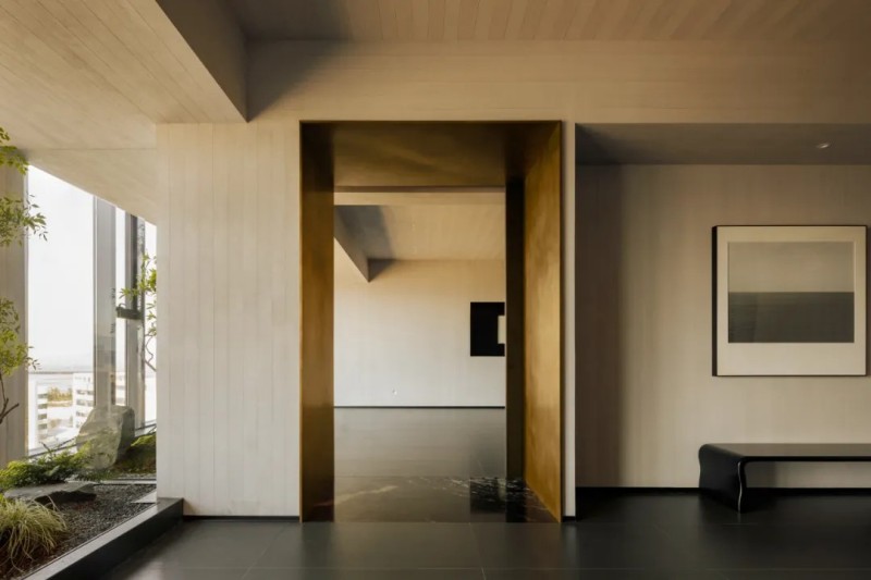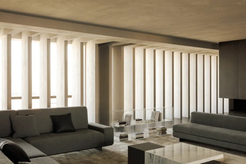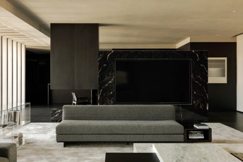 整體材質幾乎是藝術微水泥,肌理與色彩給予更沉浸式的簡約素樸,對撞局部的仿銅與大理石,凸顯空間氛圍的厚實與精細,也在簡約中增加豐富性。