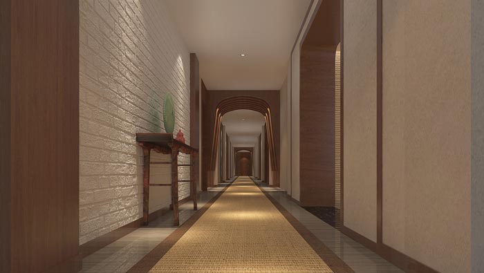 走廊的設(shè)計(jì):經(jīng)過前臺(tái)客戶通過走廊進(jìn)入客房,在空間的作用上走廊起到連接兩個(gè)空間的作用,這樣的空間給了設(shè)計(jì)師很大的發(fā)揮空間,首先就是地毯的設(shè)計(jì)與選擇,土黃色的地毯與深色的外延,讓人感受到貴賓一樣的待遇,好似古代達(dá)官貴人出行紅地毯鋪路的場(chǎng)景,同時(shí)在空間意境的感染下,讓客戶的心得以靜下來,去聆聽空間的故事。