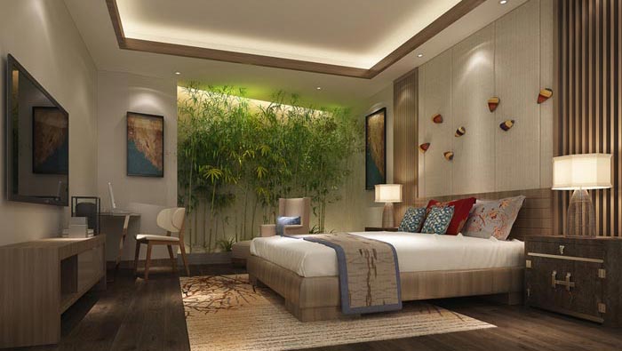 自然客房的設計:此空間的亮點就是竹子,竹子在古代的文人墨客之中聲名遠揚,因為竹象征氣節,寧折不彎,挺直脊梁,同時也彰顯君子的氣節,雖不粗壯,但卻正直,堅韌挺拔,不懼嚴寒酷暑,萬古長青,這也是設計師認為的君子之道,設計師希望大家的生活一天比一天好,意味竹子開花節節高。
