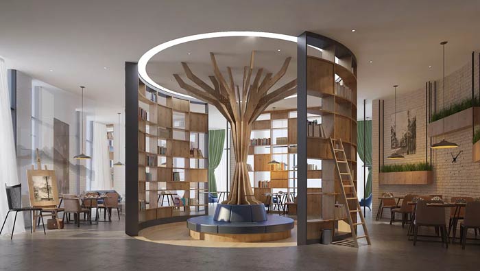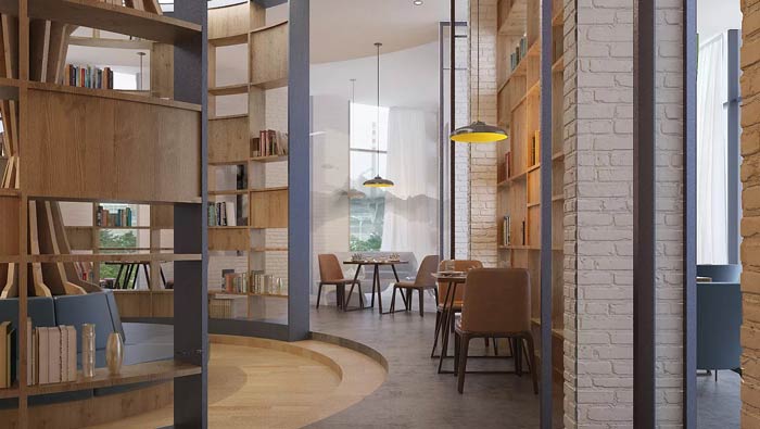 咖啡廳閱讀室裝修設計:兩個半圓圍繞而成的閱讀區(qū)域,兩個半圓以圖書架的方式出現,既起到阻隔空間的作用,同時也起到擺放書籍的作用,客戶在這里可以享受到暫時的寧靜。