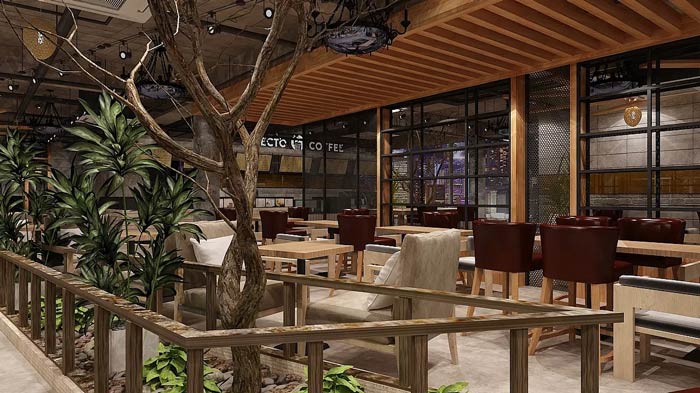 咖啡館樹木裝飾設計:樹木位于桌子的內側,之所以這樣安排,是希望讓客戶感受一下在大樹下看書的感覺,在鋼筋水泥的城市中,設計師希望拉近人與自然的關系。
