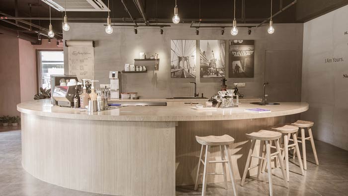 咖啡店吧臺區(qū)設(shè)計:半圓的吧臺區(qū),在很大程度上減少了對空間面積的影響,半圓吧臺集合了前臺、工作區(qū)域、休息區(qū)域,小空間被賦予大作用。