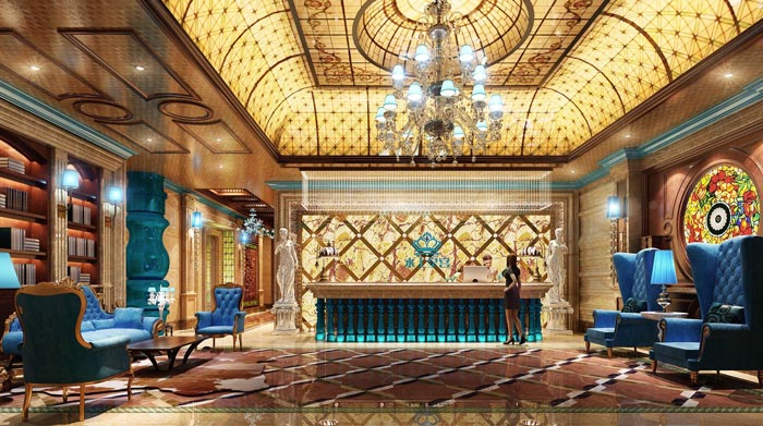 設計師根據業主的定位要求,本案力求奢華,在材質上大量采用實木雕刻,各類進口大理石,玻璃鋼,教堂彩玻璃等高檔材質,極盡奢華感。