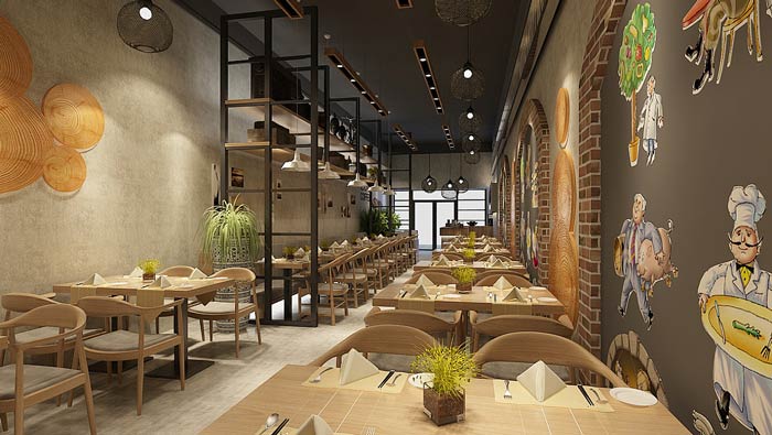 本次為面館裝修設(shè)計(jì)方案,面館空間呈長方形分布,設(shè)計(jì)面積不到100平方,故此設(shè)計(jì)師在面館設(shè)計(jì)中,以極簡為設(shè)計(jì)原則,在設(shè)計(jì)師看來小空間就應(yīng)該以簡單、便捷為主,簡單的設(shè)計(jì)符合空間本身的需求,便捷的設(shè)計(jì)符合面館實(shí)際的需求,以此打造一個(gè)簡單、便捷的面館裝修設(shè)計(jì)方案。