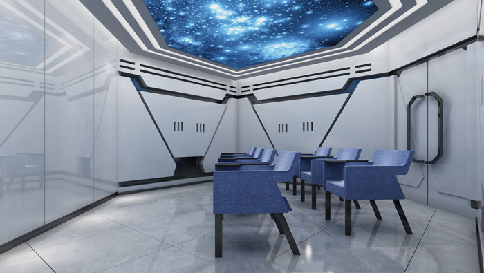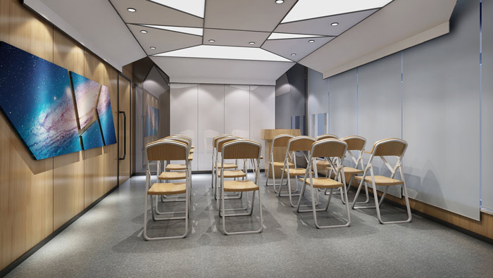 教育機構VIP教室設計:漫天的繁星讓我們仿佛身在宇宙當中,教室被設計師設計成宇宙飛船的模樣,這樣讓學員仿佛置身在宇宙的深處,去體會宇宙變化的萬象,一步一步引導學員進行深層次的思考。