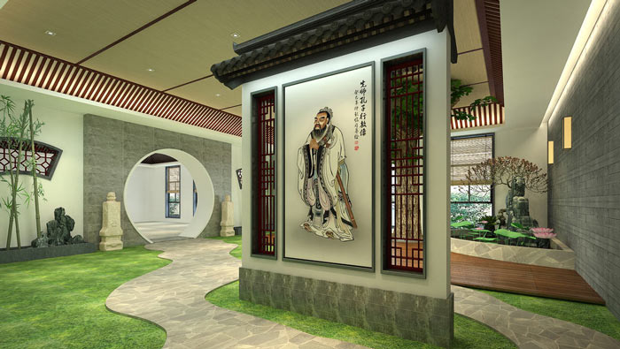 書法教育培訓(xùn)機(jī)構(gòu)庭院設(shè)計:至圣先師的畫像佇立在庭院的正中央,為空間增添了莊重之感,自然的景色更顯書法的飄逸與自然。