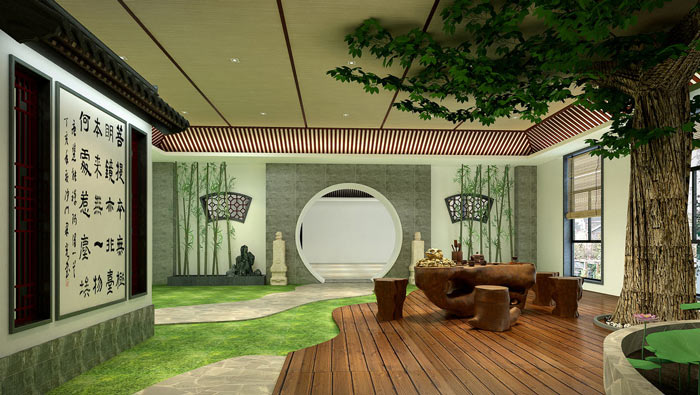 書法教育培訓(xùn)機(jī)構(gòu)庭院設(shè)計:菩提本無樹,明鏡亦非臺,本來無一物,何處惹塵埃,四局偈語表現(xiàn)的即是書法也是道理,表示書法的博大精深。