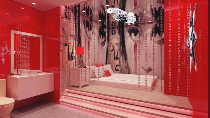 紅色誘惑客房的設(shè)計(jì):在空間之中嫵媚的紅色讓人迷戀、讓人溫暖、讓人歡愉,這樣的設(shè)計(jì)既能增加情趣,又可以建立愛人之間貼心和浪漫的氛圍,設(shè)計(jì)師希望給愛人特別的一天,讓愛人在紅色誘惑的客房之中感受到妖嬈與誘惑,在其中有幾分性感、有幾分成熟,讓人欲罷不能。