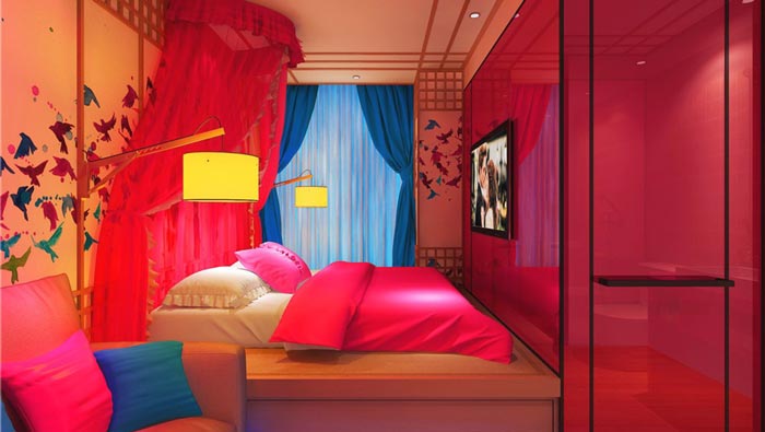 Hello Kitty客房的設計:此處給大家?guī)淼膱鼍熬褪且粋€少女的心,設計師希望在這里,讓女孩子想起自己少女年代的美好畫面,讓男孩子可以走進女孩子的心中,讓雙方彼此的感情更進一步,在這里彼此的感情會經(jīng)過不斷的發(fā)酵,進入一個新的階段。