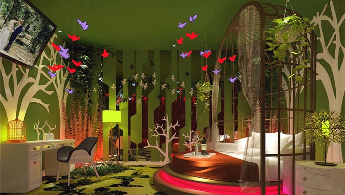 盛夏野趣客房的設計:童話世界是每一個童年的夢想,在童話中有白馬王子、小精靈、魔術、巫師等等一切,設計師希望為戀人們提供一個童話世界,讓他們在這里去感悟其中的酸甜苦辣,讓彼此化身為童話的身影,去經(jīng)歷童話中的一切,讓情感得到一次質(zhì)的升華。