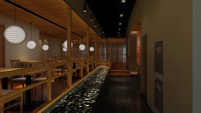 日本料理餐廳吧臺設計:師傅把制作好的壽司,放在盤子后擺在運輸帶上,運輸帶圍繞餐廳的坐臺而行,顧客可隨意食用,用膳后,店員依照顧客桌上的盤子而結算帳單。