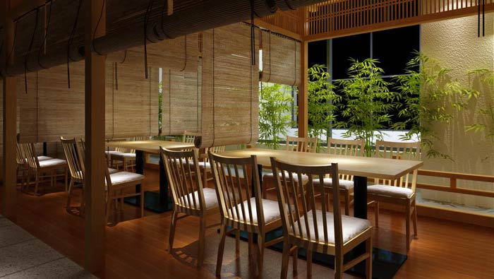 本次日本料理餐廳裝修設計方案講解到此結束,在本次日本料理餐廳設計中,設計師以竹為主要元素,設計師希望給客戶營造一個靜怡、清雅、愜意的就餐環境。