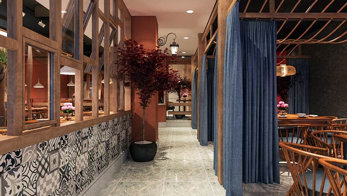 私房菜餐廳布藝窗簾設(shè)計(jì):布藝窗簾做為空間的隔斷來使用,既可以起到阻隔的作用,同時(shí)也簡(jiǎn)單、便捷,拉上形成一個(gè)獨(dú)立的就餐空間,拉開整個(gè)空間融為一體,即便捷又方便。