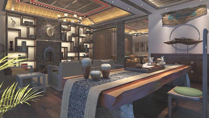 前臺的設計:當顧客進入空間之后,仿佛進入到一個茶室,同時中式的裝飾引入我們的眼簾,中式是中華文化的延伸,在這里顧客感受到的是博大精深的中華文化,這樣的環境可以讓人的心慢慢的放松下來,在這里沒有繁雜的社會、沒有快速的生活、沒有吵雜的環境,有的只是安靜的氛圍,讓我們感受到生命的美好。