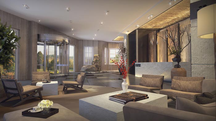 前臺的設計:對于商務人士來說,有時候休息都是一種奢求,每日忙碌的工作讓我們會有一種身心疲憊之感,故此設計師在前臺設計中,加入了自然的元素,讓人在此次感受不到工作的壓力,整個環境都十分愜意,讓客戶從忙碌的生活中脫離出來。