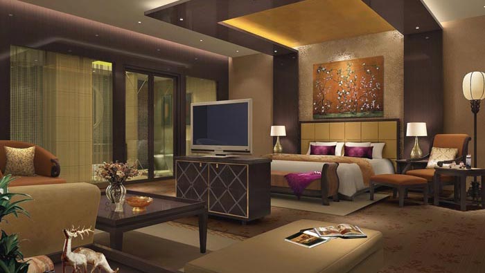 總統套房臥室的設計:靜怡是此處給人的感覺,在這里給人的感覺不僅是安靜,而更多的是文化的熏陶,床邊的躺椅讓他們躺在那里看書,閱讀書籍是一種享受,在設計師看來書籍是連接古代先賢的重要媒介,在這里顧客的心可以完全安靜下來,去體會心外無物的哲學問題。