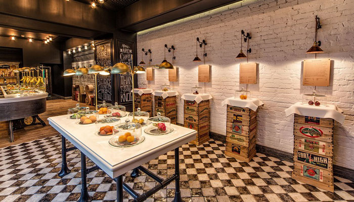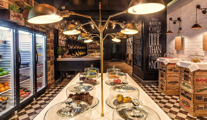 設計理念:復古的設計風格希望能為以健康生活方式為理念的擁護者,打造一個放松舒適俱樂部的氛圍,提供客人新鮮的水果、果汁、沙拉、果醬或是葡萄酒,也希望讓客人了解以水果為主的飲食習慣的優點。