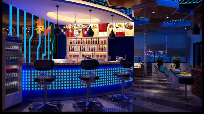 地面?zhèn)€性的地面拼花放射性的效果和吧臺融為一體,暗藍色的肌理漆,很好的鋪墊了大環(huán)境,木紋的裝飾個性爾舒適,設(shè)計的基本原則是少花錢出效果。