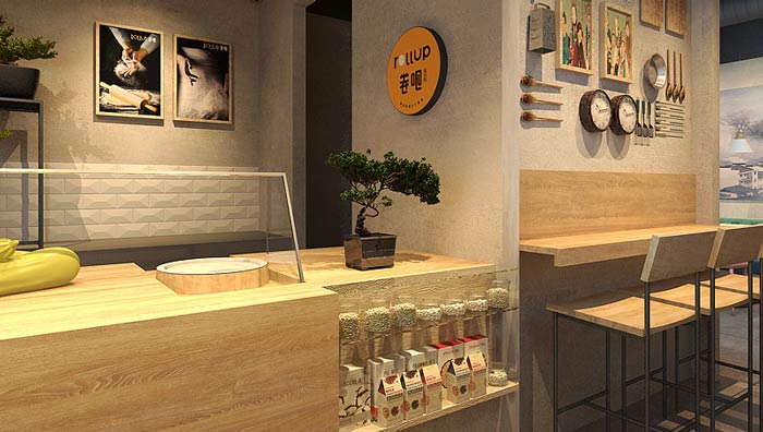 飲品小吃店柜臺裝修設計:進門直接看到的就是飲品和卷餅,這樣可以直觀的告訴客戶,這里有什么,設計師講究的是以事實說話,而不是以其他方式來展現,這樣的設計簡潔、直觀。