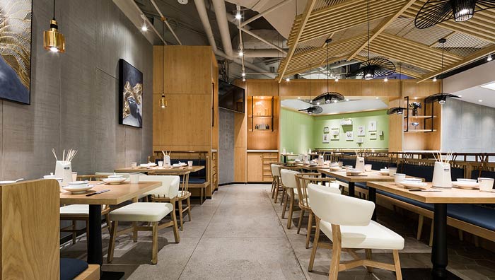 小吃店餐區裝修設計:簡約、精致、柔和的餐區設計,為小吃店營造了不同的就餐氛圍,在這里環境好、美食香,兩兩相加絕不是一加一,而是為傳統的小吃店賦予了全新的生命。
