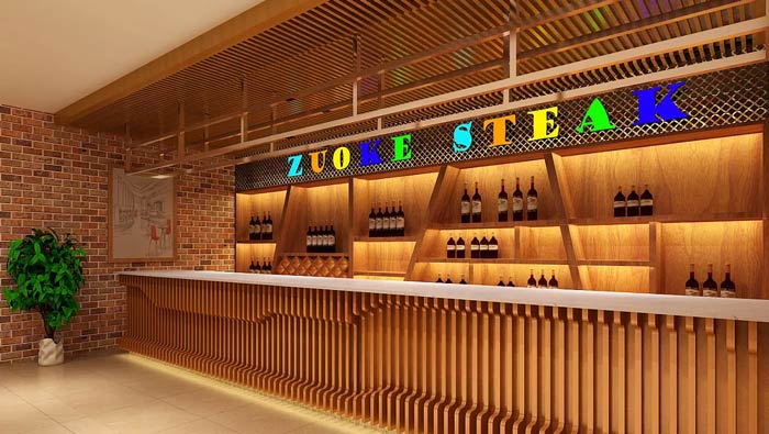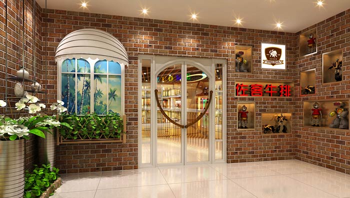 牛排西餐廳外立面裝修設計:牛排是餐廳的主打餐品,故此設計師在設計中,將牛排二字特意提出,目的就是在于強調(diào)餐廳的屬性,讓客戶知道這里的餐品是什么,而不是一概而論。