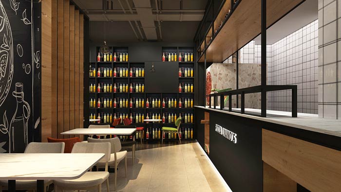 主題西餐廳進門區裝修設計:進門左側是吧臺,這是展示著各式各樣的披薩,將披薩放在空間的進門區域,是希望讓客戶在進門的第一瞬間,就被餐廳的美食所吸引。