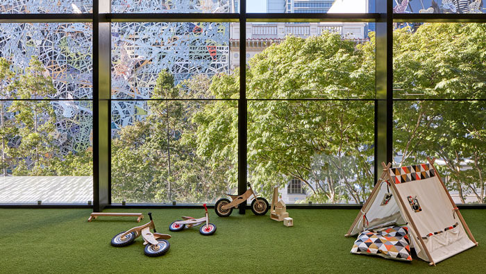 早教中心休息區(qū)設(shè)計(jì):孩子都愛赤腳走路,故此設(shè)計(jì)師在休息區(qū)的設(shè)計(jì)中,沒有設(shè)置座椅,只是將草坪安置在其中,孩子在其中赤腳坐在那里休息,帳篷讓孩子在自然中休息。
