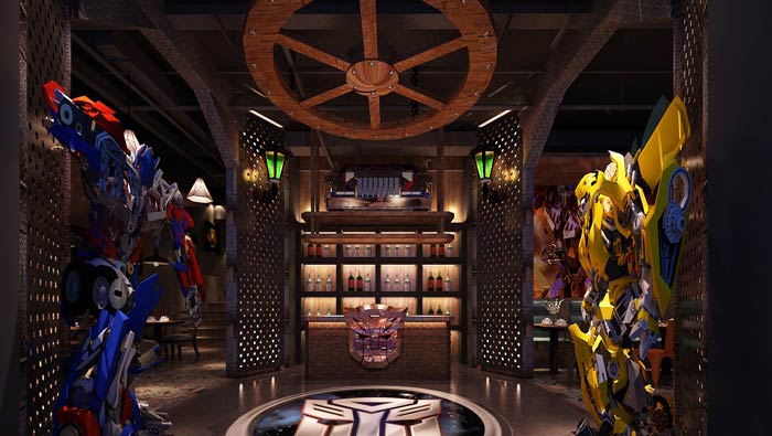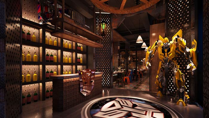 主題餐廳大廳設(shè)計(jì):大黃蜂位于進(jìn)門區(qū)的一側(cè),無論樣式、身高、真實(shí)度與電影中的高度一致,這是為了讓客戶在現(xiàn)實(shí)中看到,以此滿足長久一來只能在電影中看到的缺憾。