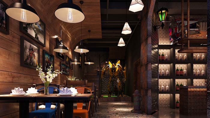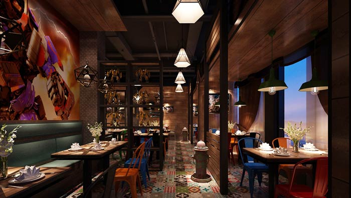 本次為變形金剛主題餐廳裝修設(shè)計(jì)項(xiàng)目,餐廳設(shè)計(jì)整體圍繞變形金剛為主題設(shè)計(jì),以舒適、情懷為設(shè)計(jì)理念,圍繞著磚、石、鋼、木、玻璃、混凝土六元素展開,在環(huán)境風(fēng)格上表達(dá)出與眾不同的自然與人文氣息,從自然形態(tài)中吸取靈感,將空間的設(shè)計(jì)特性詮釋得淋漓盡致。