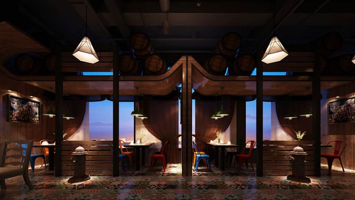 主題餐廳二樓餐廳設(shè)計(jì):弧形的墻壁為我們帶來一種感覺,好像這里的時(shí)間都發(fā)生了變化,在這里我們好像回到了以前,回到了我們曾經(jīng)的美好時(shí)代。