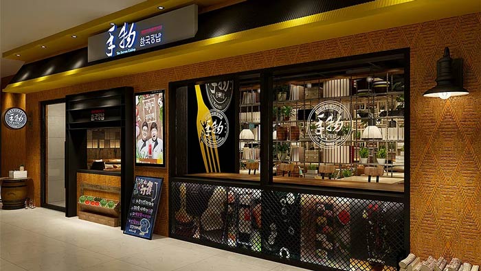 韓式主題餐廳門面設(shè)計(jì):韓國傳統(tǒng)紫菜包飯,手物代表的是手工做的食品,在這里的一切都是手工做的,讓客戶品嘗到曾經(jīng)的美味,告別現(xiàn)在的快銷食品,讓一切回歸手工。