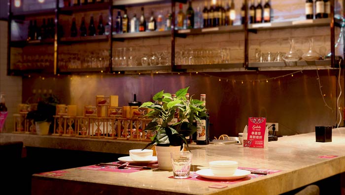 主題餐廳酒架設計:酒架位于吧臺的內部墻體之上,酒架的引入改變了空間單調的空間氛圍,在一定程度上讓空間更有活力,將空間變的活力十足。
