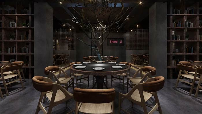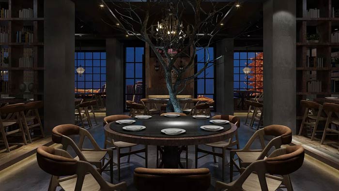 特色主題餐廳裝飾設計:中式元素強調的就是人與自然、人與物之間的關系,這里將這種關系進行了很好的融合,讓設計與建筑、與環境、與自然很好的進行融合。